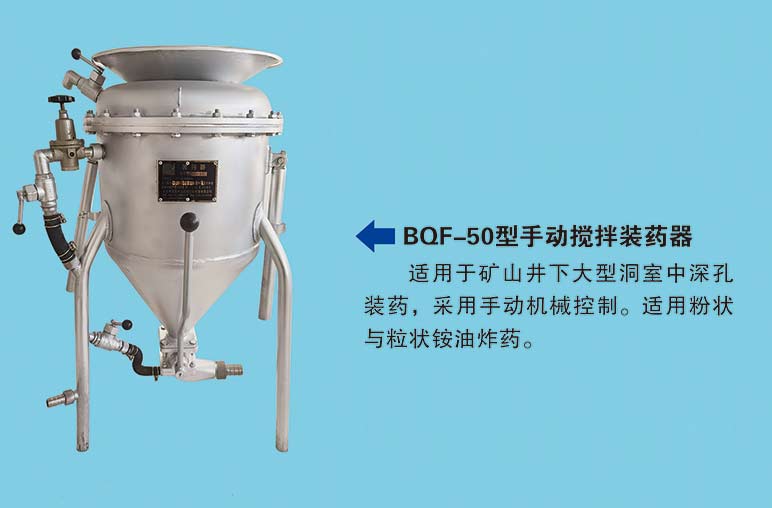 BQF-50 型抬杠式有攪拌裝藥器,適用于礦山井下大型洞室中深孔裝藥,采用手動(dòng)機械控制。適用粉狀與粒狀銨 *油 *炸* 藥。