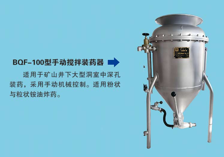 BQF-100型抬杠式有攪拌裝藥器,適用于礦山井下大型洞室中深孔裝藥,采用手動(dòng)機械控制。適用粉狀與粒狀銨* 油* 炸* 藥。